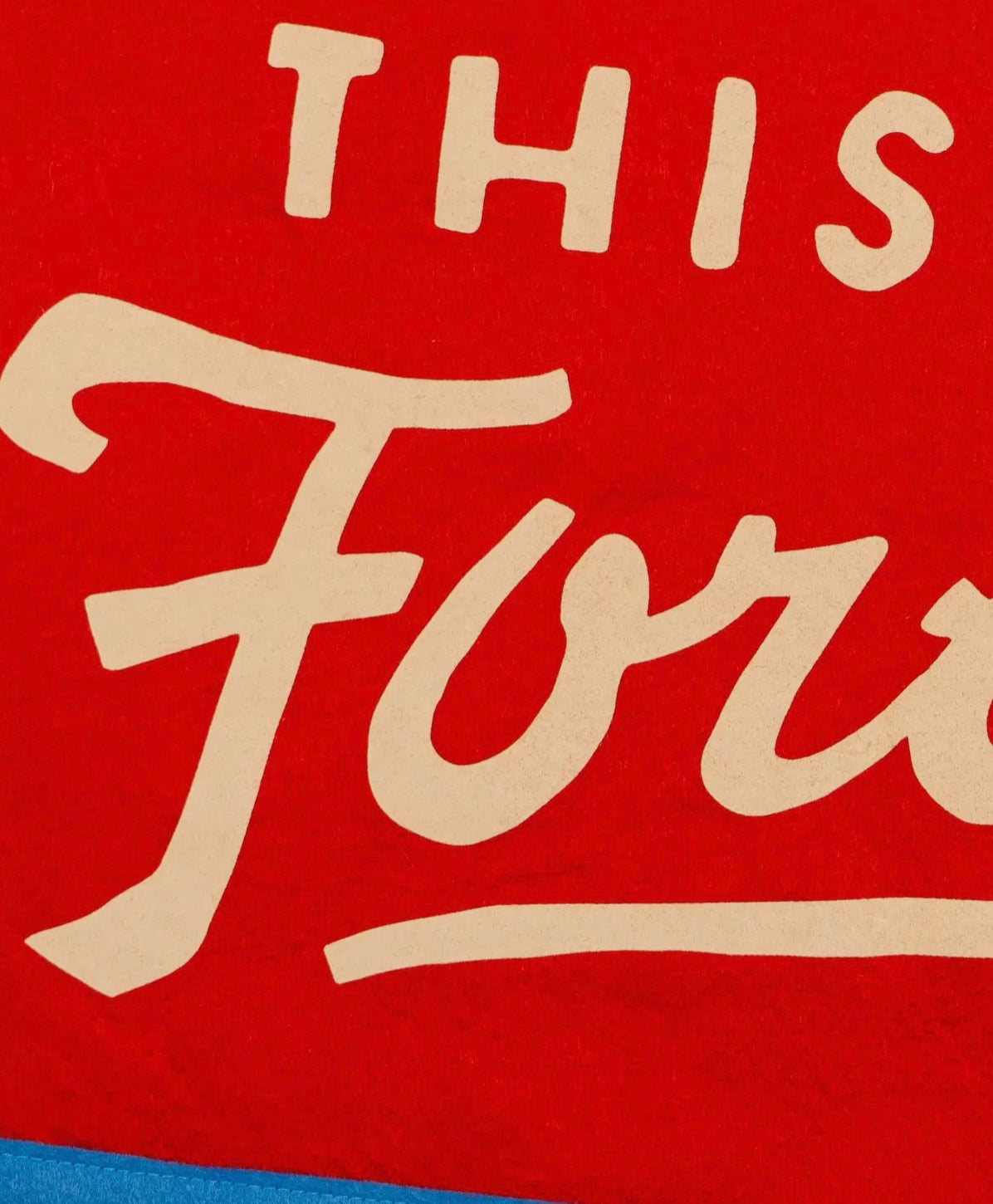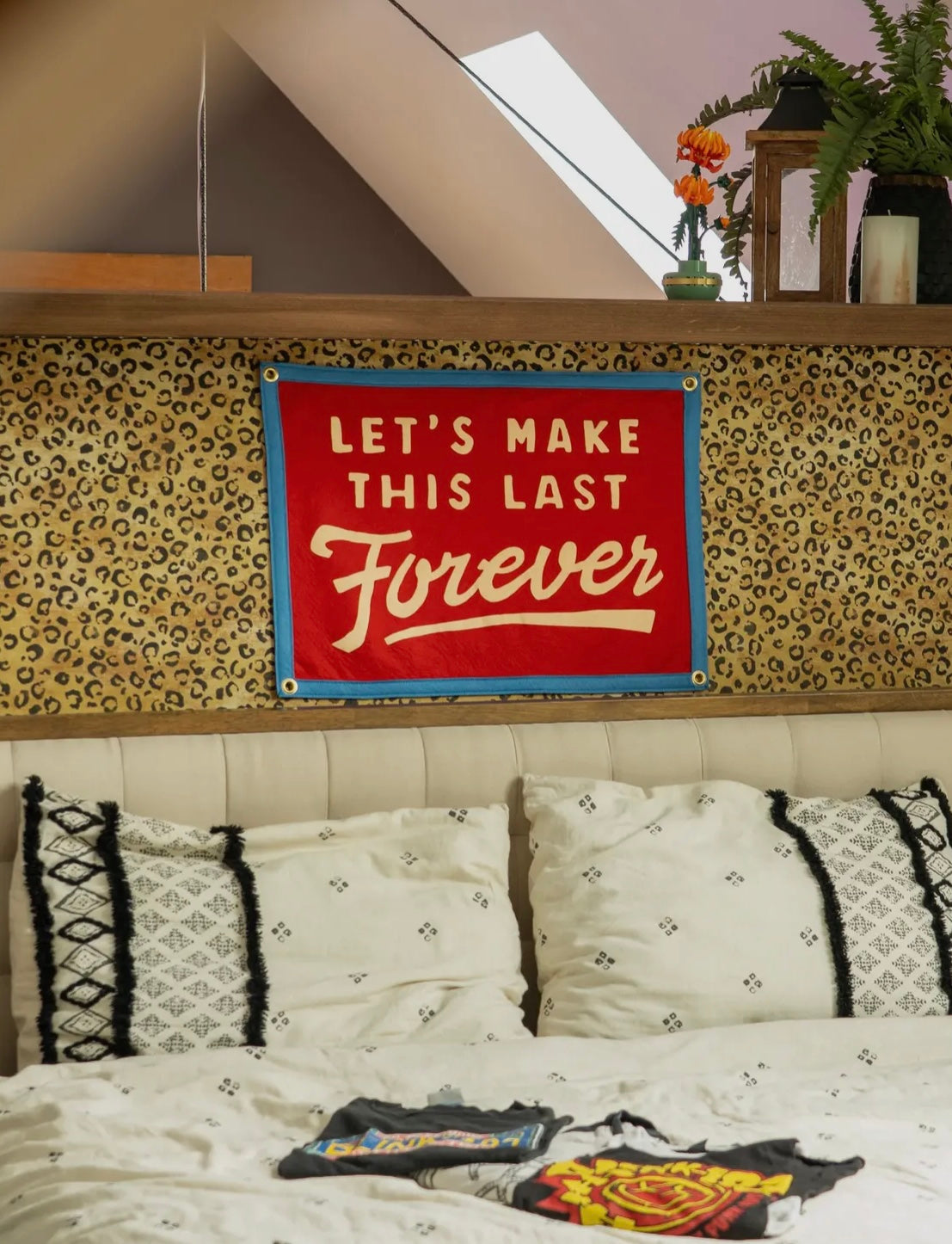 Big feelings, bold colors, and a lyric that defined your eighth-grade soulmate. This red and blue camp flag is for anyone who still believes in forever (or at least until the next track).