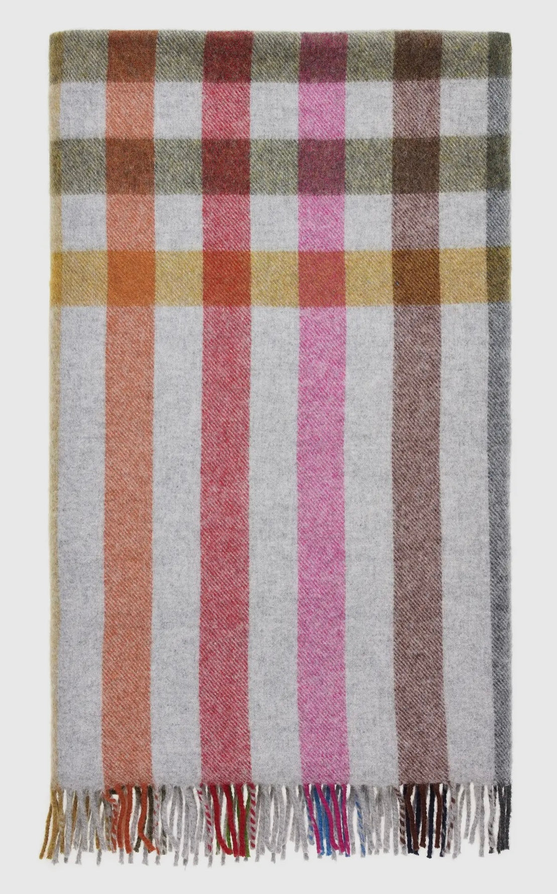 Approximate size including fringe 55" x 72" (w x l). Merino Wool.